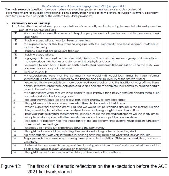 Student fieldworkers provided valuable service-learning reflections from the three groups visiting the farms. Students had to reflect on 18 questions structured around their expectations and the integrations of the ACE activities within their course, but most of the questions were on rural housing conditions, social and cultural exchange, engagement, and activities they enjoyed the most or the least. The students' reflections were coded holistically around themes that identified their expectations, experience, and emotions during the fieldwork. The holistic coding of themes from transcriptions and reflections provided analysed categories, using the constant comparative approach (Petri, 2015: 98).