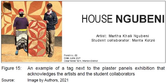 The dissemination COIL (Stage two) made provision for the exhibition (Stage three) consisting of posters with text narrative and photos of activities and plaster panels prepared after litema practices were completed on the earth walls. In some cases, the plaster panels reflect the same litema designs on the dwellings where the female students worked with the litema artists (homeowners). Figure 15 shows a tag accompanying the plaster panel with the student, the artist, and her work that inspired the panel design. This is a visual dialogue between the artists and the memory of the student's experience during the workshops of June 2021. A maximum of 20 panels can be exhibited with the posters to celebrate the role and skill of the female artist who worked together with female students.