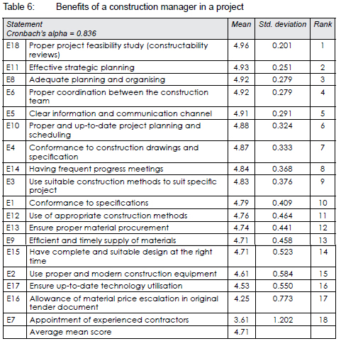 Table 6 ranks the mean scores for the benefits of having a construction manager in a project. The average mean score was 4.71 and the Cronbach's alpha of 0.836 is regarded as 'good', as it is higher than 0.70. The most important benefit of having a construction manager in a project is that proper project feasibility studies (constructability reviews) can be obtained (MS=4.96). Effective strategic planning was ranked second (MS=4.93). Proper coordination between the construction team and adequate planning and organising were ranked third (MS 4.92). The respondents agree that, if the construction manager is employed in a project, the project will likely conform to specifications, suitable construction methods will be used, conform to construction drawings, there will be clear information and communication channel and proper coordination between the construction team.