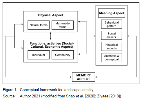 According to Shao et al. (2020); Ziyaee (2018); Okesli and Gurcinar (2012); Oktay (2006), as well as Stobbelaar and Hendriks (2004), the major components of the physical aspects/components of the landscape identity are the natural forms and the artificial components. Natural forms include the topography and landforms, vegetation, climatic conditions, and hydrography. Artificial components include buildings, structures, landmarks, sculptures, streets, sidewalks, squares, plazas, land-use pattern, and street furniture. Several authors, including Ziyaee (2018); Ramos et al. (2016); Okesli and Gurcinar (2012), as well as Stobbelaar and Pedroli (2011), concur that the aspects that form the sociocultural dimension of landscape identity include the demographic features of a given context in terms of population and literacy; the socio-economic features in terms of social and economic activities; the cultural characteristics in terms of cultural activities and beliefs, and in terms of the behavioural feature of social relationship activities. The meaning and perception aspect of landscape identity, according to Shao et al. (2020: 4), consist of the historical component that comprises historical buildings, and historical events; the aesthetic and perceptional features comprise the perceptions based on seeing, hearing, smelling, tasting, and feeling. The last on meaning sub-component comprises the aspects of memory in terms of collective memory, individual memory, and place attachment. Shao et al. (2020: 12) posit that the memory aspects are significantly correlated with the positive landscape identity for the locals. The study concluded that the memory aspect is an important factor for the local residents to perceive local identity.