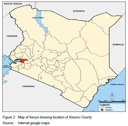 The study was conducted in Kisumu City, the third largest urban area in Kenya (see Figures 2 and 3). Kisumu City is the main administrative centre and headquarters of Kisumu County and is 265 km north-west of Nairobi. It lies on the Eastern shores of Lake Victoria, the continent's largest freshwater lake, and is 1,146 metres above sea level and located 0o6' south of the Equator and 34o45' East (AFD, 2013). In 2022, the city covered an area of 417 km2 (157 km2 of water and 260 km2 of land), with a population estimated at over 500,000 people (Wamukaya & Mbathi, 2019). According to KNBS (2019: 20), on Kenya's population and housing census 2019, the study area (Kisumu town area and its outskirts) falls within Kisumu Central Sub County that has a total population of 174,145 people, consisting of 84,155 males (48.3%), 89,985 females (51.7%), and 52,331 households. The Kisumu town area has a total population of 56,498 people and 17,258 households within a land area of 25.4 km2. Sub-locations within the Kisumu town area include Kaloleni, Bandari, Southern, Northern, and Kanyakwar.