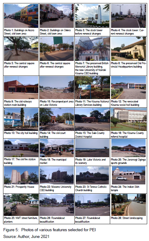 The PEI sessions were carried out in September 2021. The respondents for the PEI were engaged in the interviews based on availability and willingness to participate in the sessions that lasted one hour. The researcher used structured interview questions (see Appendix A) geared towards the study objectives but was open to clarifications from the participants who gave further insights into the reason for their choices and opinions. The first part of the PEI checklist obtained the interviewees' demographic information such as age, gender, profession, duration of residence, and area of residence in Kisumu City. In the second part of the interview the PEI interviewees were presented with six A3 sheets with four photos each that were discussed one at a time in terms of which ones best represent the physical, sociocultural, and economic aspects of urban landscape identity in Kisumu City. A total of 24 photos were discussed about what constitutes Kisumu City's urban landscape identity. They were also asked to select the photos which, they opined, had features that best represent urban landscape identity, namely aesthetically appealing, historical development, individual memory, collective memory, and symbolic meaning contributing to the image and identity of Kisumu City. The last part using 4 photos on one A3 sheet (Figure 5; photos 25 to 28) involved the interviewees' opinions on the outcome of the various works carried out under the urban renewal projects such as street and roundabout beautification, NMT implementation, and a result of parks rehabilitation that are visible within the CBD to most of the residents and visitors.