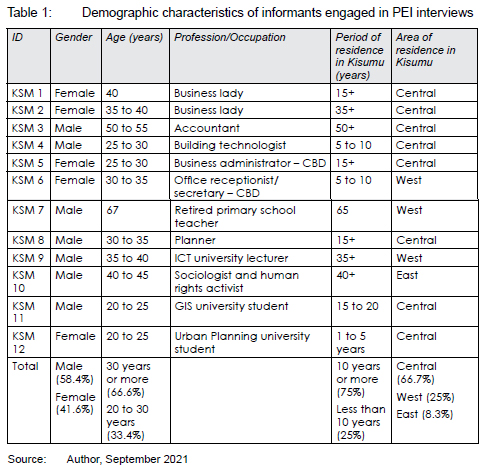 This section first presents the interviewees' demographics, followed by the PEI participants' responses in terms of the various aspects that contribute to the image and resultant identity of Kisumu City. It first presents the responses on physical aspects, then on sociocultural aspects, and on the meaning aspects as attached to various purposively selected features.