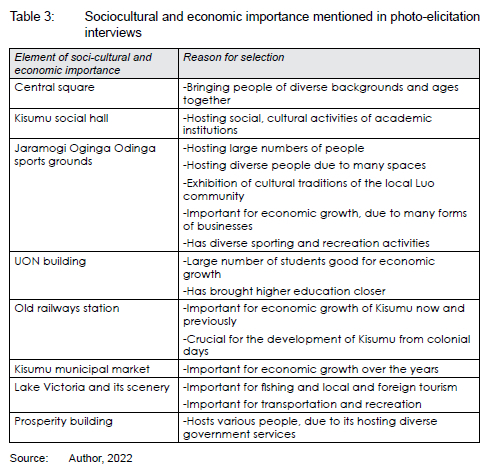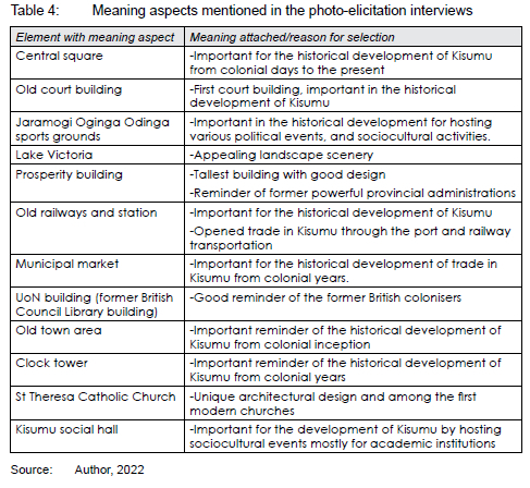 As noted in Table 4, the emerging reasons for the meaning attached to the selected features is due to their importance in the historical development of Kisumu City over the years; they present aesthetic appeal either for good scenery as natural aspects or for good architectural design. The features are a good reminder, due to several years' existence within Kisumu City. Hence, the high level of attachment and meaning associated with them.