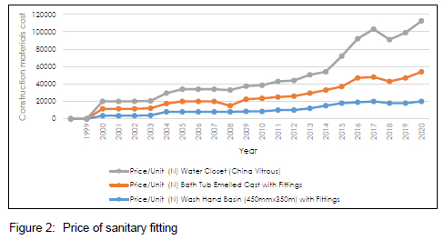 The price of a wash-hand basin (450mmx350mm), bathtub enamelled cast and water closet (China vitreous) with fittings per unit increased by 143%, 88%, and 76%, respectively, from 2000 to 2010. The same items' unit prices increased by 100%, 127%, and 225% between 2011 and 2020, as shown in Figure 2.