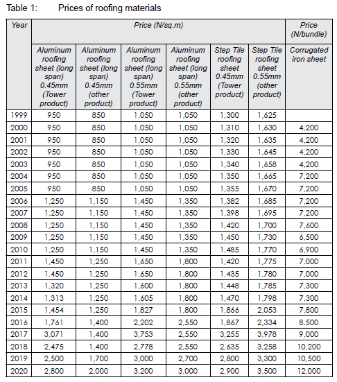 The trends in the prices of roofing sheets in Nigeria, as shown in Table 1, indicate an upward price movement from 1999 to 2020. The price of corrugated iron sheets, which was N4,200 per bundle between 1999 to 2003/2004, increased to N7,600 in 2008 and was sold for N12,000 in 2020. The price (per sqm) of aluminium roofing sheet (long span) 0.45mm (Tower product) was N950 between 1999 to 2005, but it increased from N1,250 in 2006 to 2010 and increased further to N1,450 in 2011 and sustained price till 2012. The price decreased to N1,320 and N1,313 in 2013 and 2014, respectively; it increased to N1,454 in 2015 and maintained this trend at N2,475 per unit cost in 2018. Between 2019 and 2020, it increased from N2,500 to N2,800. In addition, there has been an increase in the price of other brands and sizes of roofing sheets such as aluminium roofing sheet (long span) 0.55mm (Tower product), step tiles roofing sheet 0.45mm (tower), step tiles roofing sheet 0.55mm (tower), waterproof membrane 4mm thick Italian membrane, aluminium roofing sheet (long span) 0.45mm (other product), and aluminium roofing sheet (long span) 0.55mm (other product). This implies that the cost of roofing materials increased consistently from 1999 until 2020.