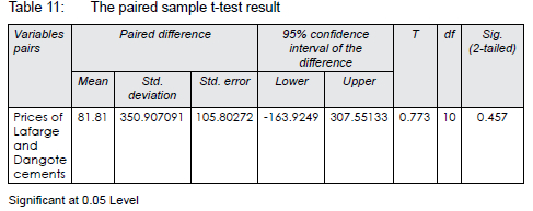 The correlation results in Table 10 show that, from 2011, there has not been any significant difference (p>0.05) between exchange rates and the prices of Lafarge and Dangote types of cement. In Table 11, results from the paired-sample t-test (p=0.457) show that there was no significant average difference between the prices of Lafarge and Dangote types of cement (t=0.733, p>0.05). On average, Lafarge cement prices were 81.18 Naira per unit higher than Dangote cement prices (95% CI [-163.9249, 307.5513]).