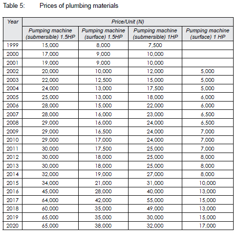 Using 1999 as the base year, the price of 1.5 HP surface and submersible pumping machines increased by 102.9% between 1999 and 2010 and 168.5% between 2011 and 2020. The price of 1HP surface and submersible water pumps increased on average by 140% between 1999 and 2010 and by 85.43% between 2011 and 2020.