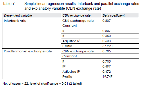 Investigation revealed that the CBN exchange rate affected the interbank rate as well as the parallel exchange rate positively. The resulte of the zero-order correlation analysis,as per Table 6. revealed a positive correlation between the CBN exchange rate and the interbank exchange rate (r=0.807); the CBN exchange rate and the parallel exchange rate (r=0.705), and the interbank exchange rate and the parallel exchange rate (r=0.496). The simple linear regression results (see Table 7) show that the CBN exchange rate was a significant explanatory variable for the interbank rate (r2=0.650) and the parallel exchange rate (r2=0.497). For this study, this meant that when the CBN exchange rate positively increased by 1 value, the interbank and the parallel market exchange rates rose by exchange rate values of 0.807 and 0.705, respectively. The F-ratios (37.220 and 19.747) were significant, showing that tee simple linear regression equations were reliable.