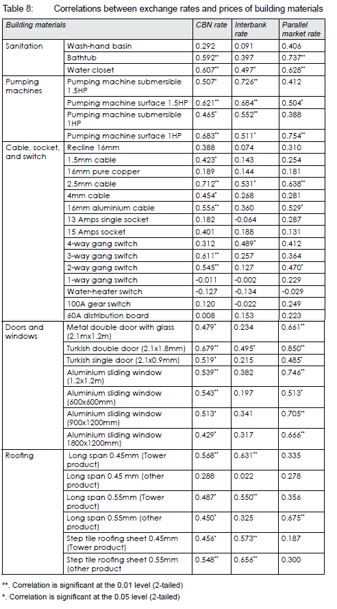 For this study, a Pearson's correlation test with p=0.05 was done to find any significant relationship between exchange rates and prices of building materials. However, to measure the real relationship between different variables when time-series data is analysed, the collected data were transformed, using the first and second differences in making the data stationary. This implies that the change in one variable is tested against the change in another variable to accurately predict the causal relationships between the variables through a correlation test.