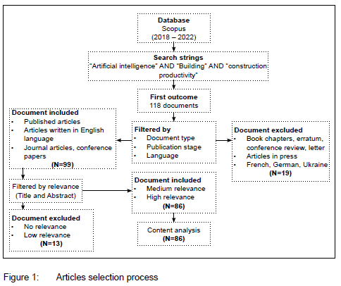 The database was explored on 11 August 2022, to extract publications relevant to the study. The search keywords used include "artificial intelligence" AND "building" AND "construction productivity". The search yielded AI articles that consider productivity in the building sector. The documents extracted were journal articles, conference papers, book chapters, erratum, conference reviews, and letters. The database produced 118 documents.