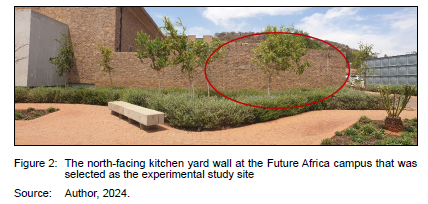 Following the funding of the experiment construction through Innovation Africa, the University of Pretoria's Future Africa campus (25.7515° S, 28.2608° E) in the Tshwane area was selected as the study site. Moreover, the study site fits in well with the theme of the Future Africa campus, which entails urban food gardens. The site was also chosen due to its characteristics, representing a typical urban area, as it consists of 50% built-up cover, including buildings, paved surfaces, and roads (Schneider, Friedl & Potere, 2010: 1733). It was essential to select a full-sun area to provide for the microclimatic requirements of traditional African vegetables. The north-facing kitchen yard wall of the campus was selected for the experiment (see Figure 2), as it entailed a 12m2 area with no shade interference. Further selection criteria included water and electrical supply, easy access for construction, maintenance and data collection, minimal chances of interference with the LWSs' irrigation and maintenance, and legal and campus facility compliance. The University's Department of Facilities Management Permission approved the study site based on the aesthetics, functionality, and maintenance requirements of the proposed living walls.