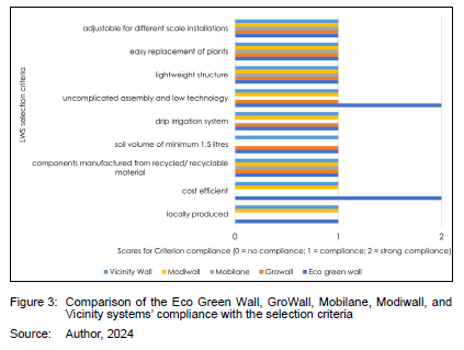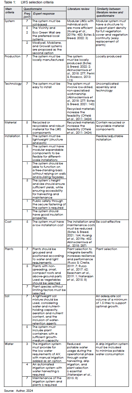 The researcher developed the final system criteria for the LWS typology selection by combining phrases within these themes following the data analysis of the questionnaire findings with the literature review findings. These criteria, shown in Table 1, included that the system must be locally produced; contain recycled or recyclable material components to limit the carbon footprint; have an adequate soil volume of a minimum of 1,5 litres to support optimal growth; must include a drip irrigation system to minimise potable water consumption; must be cost-effective; must involve uncomplicated assembly and technology; must have a lightweight structure; must have a structure to support plant density for full vegetation cover and vegetation continuity (easy replacement of plants), and must be flexible for different scale installations.