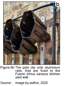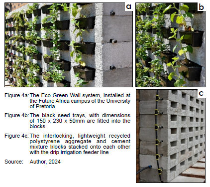 Moreover, to confirm the research by Huang et al. (2019a), the system should be modular, comprising individual and removable pots to ease the installation and replacement of plants and their maintenance. Pot sizes must preferably have a capacity of at least 3 litres with a minimum soil depth of 200mm, in concurrence with Passioura (2006), as this soil volume produces higher resilience than smaller pots of 1.5 litres. The soil should be lightweight and meet the crop requirements, ensuring sufficient aeration, texture, and drainage. The research found that one drainage hole is adequate, although the drainage hole's position must ensure drainage and limit any blockages. Although the pots' colour did not impact on their performance in the six-month experimental study, the pots' sun exposure should be limited to mitigate extreme maximum and minimum soil temperatures. Limited exposure can be achieved through the system design, with the Eco Green Wall system as an example of pots with limited sun exposure and crop protection by the structure.