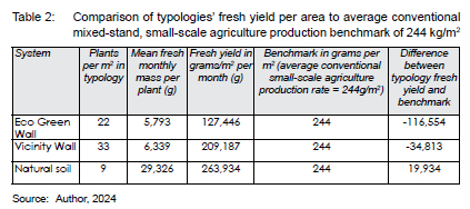 Findings related to productivity, installation, costs, and maintenance were analysed based on the researcher's observations and calculations. Area and footprint findings were calculated based on the plant's monthly yield per square meter per typology. These were compared to a benchmark average of fresh produce weight of 244g/m2, based on the average mixed-crop small-scale conventional production rates of 2.44 kg/m2 at the Rutgers Agricultural Experiment Station (Rabin et al., 2012 in Nagle et al., 2017: 34).