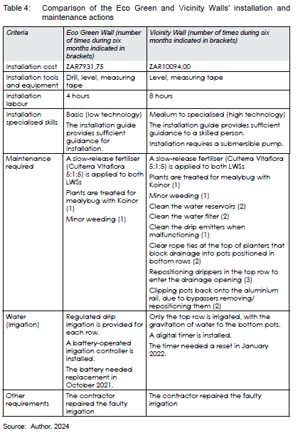 Considering the installation cost, the Eco Green Wall's installation was 21% more cost-effective than the Vicinity Wall's cost. The Eco Green Wall required fewer skills, specialised tools, and labour for installation and maintenance. Low technology, limited and robust components, and uncomplicated assembly are essential to reduce maintenance. Table 7 summarises the technical characteristics of LWSs proposed by this study for improved performance as GI for growing AV in local urban conditions (Gauteng, South Africa).