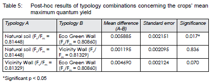The mean maximum quantum yield of photosystem II (Fv/Fm) between the crops grown in the Eco Green Wall shows a statistically significant difference with those grown in the natural soil. This implies that the crops in the Eco Green Wall experienced stress compared to the crops in the natural soil. Plant stress can be linked to temperature extremes or dry spells. However, the literature argues that the maximum quantum yield of photosystem II is associated with high-temperature stress, leaf senescence, and only extended drought stress periods (Kalaji et al., 2017: 13; Lu et al., 2002: 1173; Kotakis, Kyzeridou & Manetas, 2014: 413). The lowest maximum quantum yield of photosystem II (Fv/Fm) values were measured in the Eco Green Wall between January and March 2022, affecting between three and five crops. These levels can be explained by an irrigation malfunction of the Future Africa campus' main irrigation system in January. However, January had high rainfall and lower maximum temperatures, which might have assisted in the crops' survival. This assumption is strengthened by the Eco Green Wall's significantly low soil electrical conductivity levels, indicating low soil nutrient uptake and moisture content. Therefore, it can be assumed that the plant stress of crops in the Eco Green Wall, depicted by the low maximum quantum yield of photosystem II mean values, results from the irrigation malfunction in January 2022, leading to available water content stress. Although the Eco Green Wall's crops experienced stress compared to other typologies, the plants still coped with their environmental conditions and stresses, and their photosynthetic apparatuses were not damaged.