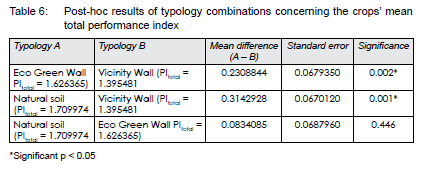 As the total performance index (PItotal) strongly correlates with plant growth, health, and survival rate (Yusuf et al., 2010: 1428; Berner et al., 2021:1; Maliba et al., 2019: 1), the trend in PItotal values over a period is a good indicator of plant vitality. The statistically significant difference in the total performance index (PItotal) between the crops in the Vicinity Wall with the Eco Green Wall and the natural soil shows that the Vicinity Wall's crops experienced more stress than the other typologies. Investigating the periods of the highest plant stress, January 2022 showed the lowest PItotal values in five crops. The plant stress in January 2022 is also visible in the low soil electrical conductivity and the volumetric water content levels, which indicates the soil nutrient uptake and moisture content. These levels can be explained by the irrigation malfunction in January. Therefore, it can be assumed that the plant stress of the Vicinity Wall's crops, depicted by the low PItotal mean values, due to the irrigation malfunction in January 2022, leading to available water content stress. However, although the Vicinity Wall's crops experienced more stress than crops in the Eco Green Wall and natural soil, the plants still coped with their environmental conditions and stresses, and their photosynthetic apparatuses were not damaged.