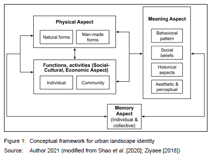 Urban and landscape identity is formed by physical aspects, social-cultural functions, and meaning attributes of the given place that ultimately shape memory associated with a given place (Shao et al., 2020; Ziyaee, 2018; Ramos et al., 2016; Okesli & Gurcinar, 2012; Stobellar & Hendriks, 2004). For this study, urban landscape identity is defined as the residents' opinion and perception of the special features that help them differentiate and develop attachment to a place. It encompasses the forms/physical aspects, functions and activities/social-cultural aspects, and meaning aspects. All three aspects combine to create memories for the residents (K'oyoo & Breed, 2023, modified from Shao et al., 2020). Figure 1 shows the conceptual framework for urban landscape identity and its link to urban memory within the urban landscape.