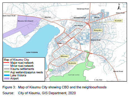 The study was conducted in Kisumu City, the third largest urban area in Kenya (see Figures 2 and 3). Kisumu City is the main administrative centre and headquarters of Kisumu County and is 265km north-west of Nairobi. It lies on the northeastern shores of Lake Victoria, the continent's largest freshwater lake and source of the Nile. Kisumu is 1,146 metres above sea level and located 0o6' south of the Equator and 34o45' east (French Development Agency [AFD], 2013). According to COK KUP (2019), the city is ranked third in terms of population at the national level in Kenya and is a major urban centre. The City of Kisumu was founded on 20 December 1901 when the railway from Mombasa reached the shores of Lake Victoria (COK KUP, 2019). The first boundaries of Kisumu town were demarcated by the British colonial government in 1903 as the area within 2.5 mile radius of the district commissioner's office. In 1972, the municipality boundary was extended. The first structure plan for Kisumu City was elaborated in 1984 but was never implemented, due to lack of political will and resources (COK KUP, 2019).