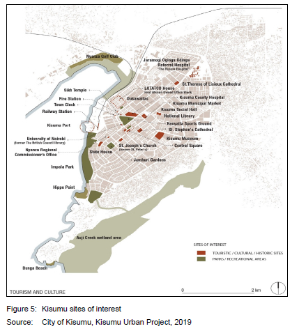 According to the City of Kisumu's situational report under Kisumu Urban Project (2019), there are several sites of interest, including parks such as Jomo Kenyatta Sports Ground (currently renamed as Jaramogi Oginga Odinga Sports Grounds), monuments such as the Clock Tower, religious buildings such as St Theresa's Catholic Church, Sikh Building. Government civic buildings including the old provincial commissioner's headquarters, Railway Station, Kisumu Port, Fire station. Educational buildings include the University of Nairobi building. Kisumu proposed that the historic and heritage core area consisting of old Asian architecture in the Old Town is also of interest. Public buildings include Jaramogi Oginga Odinga Teaching and Referral Hospital, Kisumu Social Hall, and Kenya National Library Services building, among others. Figure 5 shows the map of the various sites.