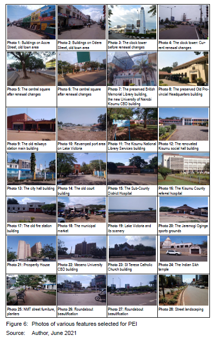 Between June and August 2021, photos used in the PEI were taken by the researcher during field investigation on-site for the ongoing and completed urban renewal projects to constitute the primary data. Other photos of interest to the study were sought from the archives of the County Government of Kisumu Offices and from the internet to constitute secondary data. The 24 photos were selected based on the COK KUP report on Kisumu City sites of interest (see Figures 5 and 6, images 1-28). According to Shao et al. (2020), social researchers prefer to produce their own PEI photos for the interviews. These are more effective in gathering feedback from the participants, as such data is more focused on the subject under investigation in the study (Shao et al., 2020).