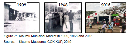 • Kisumu Municipal Market: This was constructed in 1935 and was key to the economic development of Kisumu. It continues to be a dominant commercial space where agricultural products such as cereals are traded (COK KUP, 2019). Figure 7 shows the transformation of the Municipal Market from the colonial era to the postcolonial era.