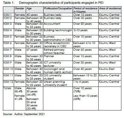 Results on the demographic characteristics in Table 1 indicate that most of the PEI interviewees were male (58.4%), aged between 20 and 67 years, of whom 66.6% were aged 30 years and over. The period of residence for the respondents was between 4 and 67 years. Nine out of 12 (75%) of the respondents had lived for over 10 years in Kisumu City. This indicates that they had lived long enough in Kisumu City to respond to questions about what contributed to their urban memory within the urban landscape over time and the effects of the urban renewal changes.