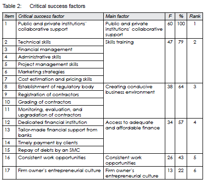 Several studies have explored the CSFs of contractors in both developed and developing countries. In an earlier study conducted in China, Lu, Shen and Yam (2008) identified 35 factors that are critical to the competitiveness of contractors. These were then clustered into eight variables, namely project management skills, organisation structure, resources, competitive strategy, relationships, bidding, marketing, and technology. In Ghana, Ofori-Kuragu et al. (2016) found that CSFs that stimulate contractor growth include quality and zero defects culture, organisation design, work culture and work environment, client satisfaction, strategy, leadership, measurement, analysis of information and knowledge management, as well as implementation of lean principles. On the other hand, in a South African study that sought to identify the CSFs that could enhance the sustainability of SMCs in the greater Johannesburg metropolitan area, Aigbavboa et al. (2014) observed that SMCs are stimulated by four CSFs, including good management skills, maintaining good relationships with clients, proper record keeping, and good cash-flow management.