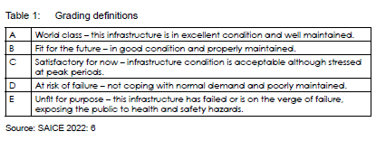 "'Satisfactory for now: infrastructure condition is acceptable, although stressed at peak periods. It will need investment in the [medium term] to avoid serious deficiencies' developing" (the definition of Grade C, SAICE, 2022: 6).