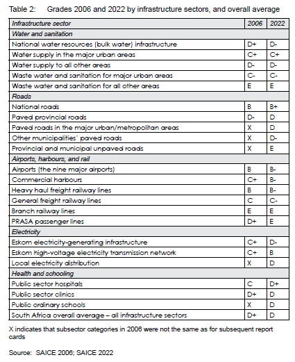 "social infrastructure continues to deteriorate. Crime and non-payment for services as well as weak institutions lacking appropriate skills and accurate data have contributed towards a further decline in the overall condition of infrastructure since the last SAICE Infrastructure Report Card" (SAICE, 2022: 11).