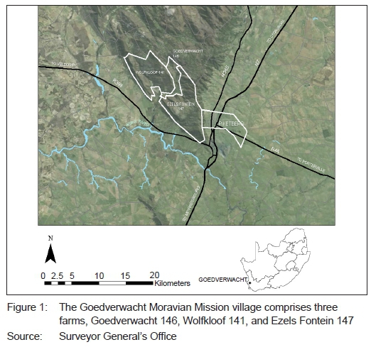 Goedverwacht is situated in the Bergrivier Municipality in the Western Cape, 25km west of Piketberg, located on private land, within a predominantly agricultural area (Figure 1). The farm is owned by the Moravian Church of South Africa and is held in trust by the Minister of Land Affairs for the benefit of the residents under the Rural Areas Act (Act No. 9 of 1987). As a result, the Goedverwacht community has not been bound by any spatial planning act or land use ordinance in the past and, therefore, has had limited state assistance with planned development. These circumstances have resulted in the village growing and developing informally along the Platkloof River (Bergrivier Municipality, 2015: 173). Residents of Goedverwacht are able to own houses in the village, but cannot obtain legal tenure of their properties. In the past, mission villages in South Africa were mainly established to provide a place for the marginalised in society, rather than to serve religious, administrative, and commercial needs. The farm Goedverwacht was first established in 1819 and was bought by the Moravian Church in 1888. Goedverwacht was slow to develop, due to the uncertainty of its inhabitants' property rights, and only achieved formal status in 1889 (Fransen, 2006: 138). Goedverwacht initially accommodated approximately 200 inhabitants; however, the town has now increased to approximately 1 979 inhabitants, according to the 2011 census (Bergrivier Municipality, 2015: 171). Goedverwacht has been administered as a private village on private land and is presently managed and run by the Overseers Board (Opsienersraad) members associated with the Moravian Church headquarters in Cape Town (Bergrivier Municipality, 2015: 171). The village sprawls in a linear development that extends for approximately 3.8km along the river. The main land use is low-density residential with subdivided agricultural land in the Platkloof River floodplain (Figure 3). Permaculture is customary in the village, with vegetable crops planted around village dwellings. Some gardens sprawl without definition, merging and mingling with neighbouring gardens, while other boundaries are well defined. Some properties sprawl across the veld to areas where animal pens and chickens are kept.