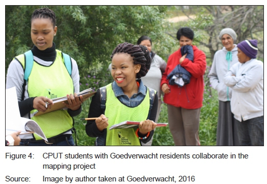 CPUT students from the, Department of Town and Regional Planning have embarked on a service-learning project, using communicative mapping at Goedverwacht. The project forms part of the third-year GIS module curriculum in the Urban and Regional Planning Diploma. The intention is to use geospatial technology (land information systems) to draw a community map in which ordinary people in the community can participate. In so doing, reciprocal learning occurs, empowering both student and resident to mobilise around the issue of land reform. Community participation in the mapping process is intended to create awareness and build social capital among the residents.