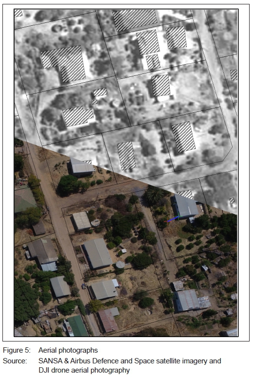 Each week, a group of twelve students was taken to Goedverwacht to spend a day in the village with the community (Figure 4). The students did various mapping tasks. The first task was to measure and map building footprints, using Mobile Geographic Information System (GIS) and a Global Positioning System (GPS) technology. During this task, dialogue was initiated between the resident and the student by making use of communicative mapping. The second task was to collect attribute data for each feature on the map (Table 2). Some of the attribute data captured was image provoking with the intention of visualising 'a sense of place' (Figure 5). A DJI drone quad-copter aircraft was used to photograph the village from approximately 100m above ground level. The aerial photographs were used to assist in determining the general boundaries by identifying fences, hedges, walls, rivers and other distinct boundary markings (Figure 5).