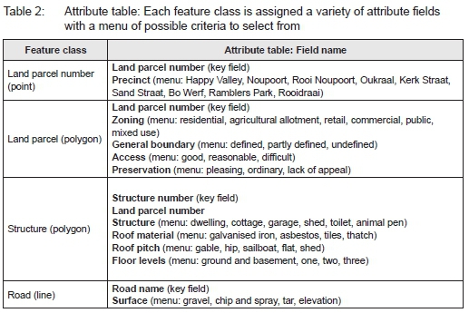 This study uses communicative mapping as a tool to describe the communal village of Goedverwacht. During the project, students from CPUT were asked to explore three different mapping techniques, including participatory, cognitive and community mapping. Each approach has its own purpose; however, when combined, a fit-for-purpose communicative mapping approach is achieved (Table 1). According to Downs and Stea (2011: 312), a physical map is only a theoretical representation of a place. Once the physical space has been mapped, the meaning behind the space needs to be known. A place does not develop in a vacuum; it is the product of the abstract interaction between the physical and cultural identity of people who reside there. Geographical information of a place is only useful if attribute data are identified to indicate the kind of place it is and what characteristic pattern of stimulation is regularly associated therewith (Table 2). According to Glassie (1975: 114), the context of a place is both descriptive (practical) and explanatory (the abstracted context).