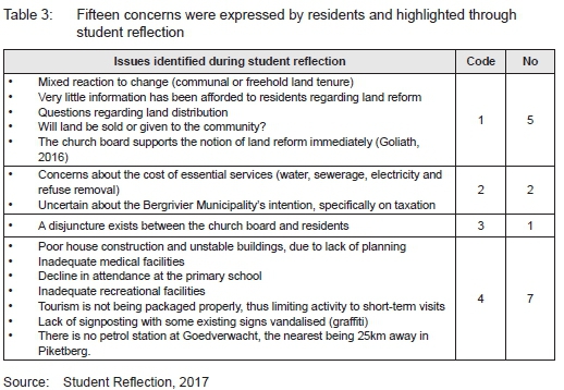 The qualitative descriptive data collected by students during the measuring exercise reveals some of the residents' concerns regarding development at Goedverwacht. The inquiry was interpreted based on the grounded theory methodology. During reflection sessions, students revealed fifteen concerns residents have as recorded in their field diaries. The fifteen concerns were coded into four categories: Code: 1 - land reform; 2 - integration with the Bergrivier Municipality; 3 - community dynamics, and 4 - infrastructure and services (see Table 3).