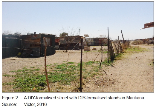 Unwilling to wait 15 to 20 years for either relocation or state formalisation of the settlement, residents implemented what was locally referred to as "DIY formalisation", a strategy aimed at "meeting the government halfway" with service delivery and formal 'development' of the settlement. During DIY formalisation, residents, under leadership of the residential committee, expanded their settlement to the east, in order to accommodate the layout and measurement of double-lane streets and 18m by 20m stands to resemble the gridiron layout of formal, suburban or RDP neighbourhoods. This was the first stage of DIY formalisation (see Figure 2 for an illustration of a DIY-formalised area).