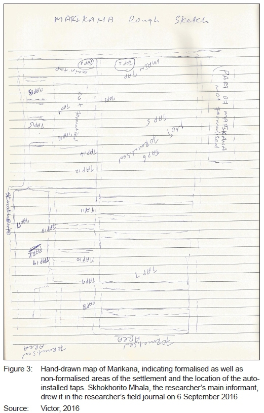 The case study captured in this article is based on a reflection of Ave weeks' participant observation conducted in Marikana informal settlement, approximately 15km outside the city centre of Potchefstroom, South Africa, from August 2016 to September 2016. During these Ave weeks, the researcher walked from house to house through the streets of Marikana with Skhokhorito, her main informant and solicitor between her and the residents. In walking through Marikana's streets, the researcher also often 'hung out' (Spiegel et al., 1999: 180) at the 20 auto-installed communal taps and inside residents' houses where she conversed with dozens of residents about their experiences of life and specifically about water provision to their settlement.