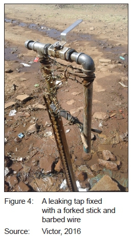 Since the residents themselves installed the water infrastructures, they also took the responsibility, or perhaps to use Haraway's (2016: 68) notion "response-ability", for maintaining these infrastructures. Leakages caused by overuse of the taps, as over one hundred people depend on one communal tap, and the consequent breakage of the tap mechanisms were quickly fixed by residents in innovative ways, such as using forked sticks and wire (see Figure 4).