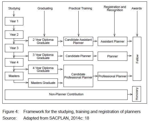The report further presents new categories of registration replacing the old ones (SACPLAN, 2014c: 11-12). The old system consisted of three categories: a Candidate Planner for all graduates prior to registration; a Technical Planner for registered planners with a National Diploma, and a Professional Planner for graduates with an Honour's, Bachelor of Technology (BTech), or Master's qualification. The new categories are as follows: an Assistant Planner for graduates with a National Diploma;12 a Planner for graduates with a three-year degree, and a requirement for Professional Planner status remains unchanged. The Council has also adopted two new awards for its membership, namely a Fellow and an Honorary status. A Fellow membership is awarded to registered planners who have rendered outstanding services to the profession. The Honorary status will be awarded to an individual who is not a registered planner, but who has made a significant contribution to the planning profession. Both awards will be based on a nomination and an appraisal process (SACPLAN, 2014c: 13). The new system introduces a new sequence through which planners grow an entire lifetime career. It removes the stigmatised label of a Technical Planner, which was condemned as stereotypical, and demeaning (SACPLAN-CHoPS meeting at DUT).13 This robust set of categories is also more distinct and clear without combining levels of qualifications. The report also stipulates the minimum competency standards for planning educators and their programmes in terms of the minimum of 60% of staff that should be professionally registered professionals as well as the minimum qualifications requirements for teaching (SACPLAN, 2014b: 37).