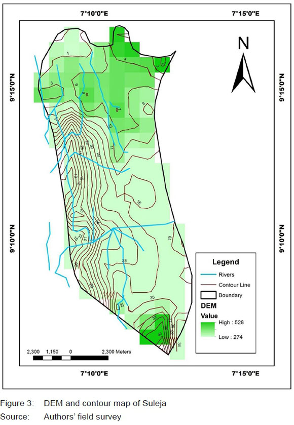 by the Board (NSUDB) (Adeleye, 2015). The refusal of the Board (NSUDB) to approve not more than 35% of the plans submitted forced developers to proceed with their building development, regardless of the obvious implications of such acts, including vulnerability to flooding. This act of disregard for development control regulations gave rise to the development of buildings on marginal land portions and flood-prone areas. To produce a vulnerability map, a digital elevation model and the contour map with the rivers (water bodies) of Suleja were overlaid. The analysis from the digital elevation model reveals that the elevation of Suleja ranges from 274 to 528 above sea level (Figure 3).