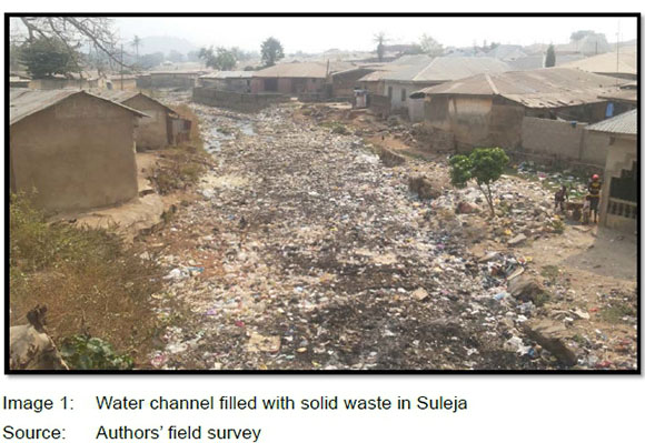 During the field survey, it was observed that uncollected solid waste littered many of the streets and water channels in Suleja (see Image 1). It was said that, since 2013, the Niger State Environmental Protection Agency collected an annual average total of 308 940 cubic meters of solid waste in Suleja. It should, however, be stated that this statistic did not seem to reflect the true picture of solid waste collection in the area, as large volumes of solid waste were left uncollected daily in Suleja (Adeleye, 2015).