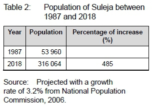 In 1976, the Federal Government's decision to move the federal capital territory from Lagos to Abuja had a significant impact on the growth of Suleja, a sub-hub of the new Federal Capital Territory. Following this proclamation, the first master plan was prepared for Suleja in 1987, in order to guide and control the increasing physical development. According to the Niger State Urban Development Board (NSUDB), the Suleja master plan expired in 1997 and is yet to be reviewed. The inability of the Niger State Government to review the master plan in 1997 is momentous to present physical development challenges faced in Suleja. Table 2 shows that, since the master plan was prepared in 1987, Suleja has recorded a significant increase in population growth. Table 2 reveals that the population of Suleja increased from 53 960 in 1987 to 316 067 in 2018, with 485% increase. The implication of the population explosion and the obsolete master plan is the chaotic physical development evident in Suleja.