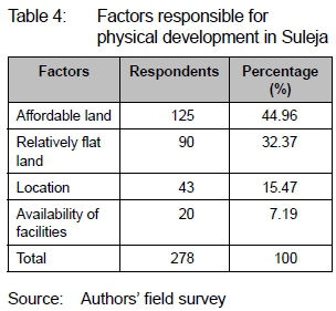 Table 4 explains the factors responsible for the purchase of land for building in Suleja. Affordability of land influenced the choice of land by 44.96% of the respondents. The respondents in this class care less about the location of their property. Relatively flat land was responsible for the choice of land by 32.37% of the respondents. Preference was given to property location by 15.47%, while the availability of facilities influenced the choice of 7.19% of the respondents.
