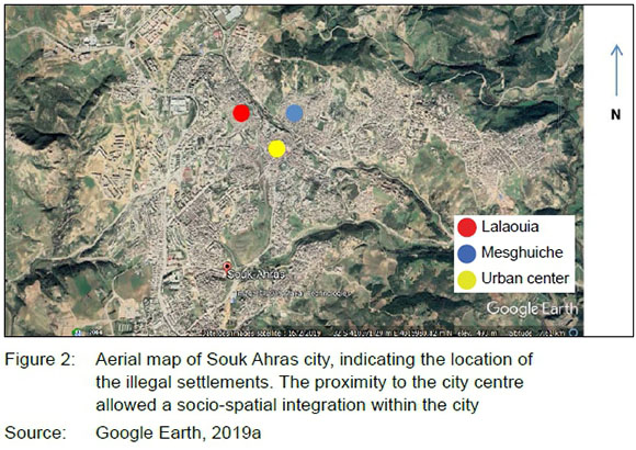 GOOGLE EARTH, 2019a. Aerial map of Souk Ahras city indicating the location of the illegal settlements. [Online]. Available at: <https://satellites.pro/Souk_Ahras_map> [Accessed: 13 October 2019]. [ Links ]