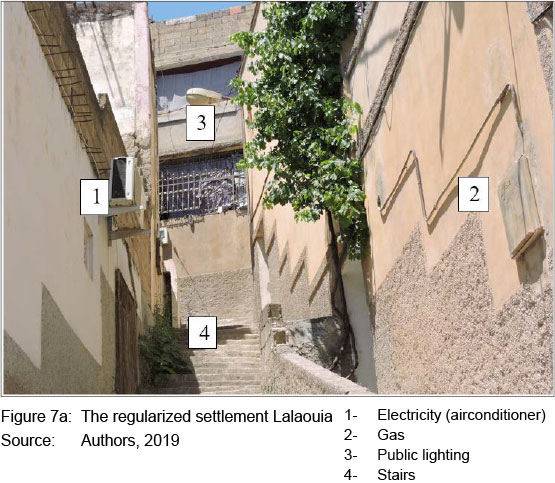 Physical upgrading represents a step towards enhancing land tenure security to informal settlement dwellers. Local authorities of Souk Ahras city preferred to upgrade the existing settlement rather than going through the costly process of destroying and rebuilding them elsewhere. The informal settlements benefited from incremental upgrading through micro-scale designed interventions. Since the mid-1970s, Lalaouia and Meguiche districts have been recognised and integrated into the communal management. In order to improve the living conditions of these informal settlements, the commune of Souk Ahras proceeded with the physical upgrading by extending the necessary infrastructure such as water, pipelines, electricity, gas, telephone, and street widening, and by setting up public facilities such as schools, medical centres, post offices, and police stations (Figures 7a and 7b). The improvement of the physical environment involved, in many cases, partial destruction of houses. Consequently, this upgrading programme granted a certain de facto recognition of these settlements and enabled security of tenure. This recognition was the first path to land regularisation.