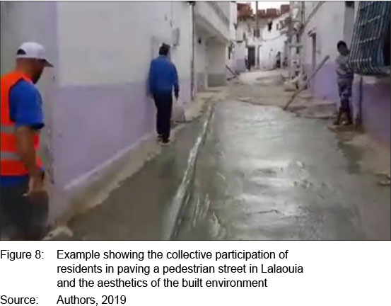 Furthermore, upgrading the informal settlement is an ongoing process that is not restricted only to local public institutions and may be initiated by residents. Indeed, the residents of informal settlements assume, on their own in some cases, the improvement of living conditions (Figure 8). In fact, the example of Lalaouia shows how residents are collectively and voluntarily involved in the process of transforming and improving their immediate surroundings and living conditions in situ.