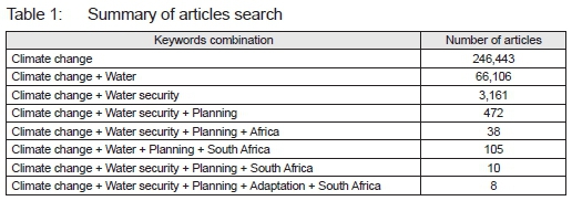 The process led to the gathering and critical review of studies, grey literature, and online information between 2010 and 2019. The study used Google Scholar, ISI, ProQuest, and Scopus search engines to locate these studies, using keywords such as 'climate change', 'water security', 'planning', and 'coping strategies', in general. These keywords were then merged to include 'Africa' and 'South Africa', in particular. Table 1 shows that, from the 246,443 articles that were recorded for climate change, 66,106 articles dwelt on climate change and water, in general. The review was narrowed down to 3,161 articles that dealt with climate change and water security, and further to 472 articles that discussed climate change, water security, and planning. In addition, from the search, only 38 articles dwelt on all the keywords in relation to Africa. It is interesting to note that of the 105 articles on climate change, water, and planning in South Africa, only 10 studies discussed climate change and water security per se in relation to planning in South Africa (Ziervogel, Shale & Du, 2010: 94-110; Mander et al., 2017: 261-271; Nieuwoudt et al., 2018: 26; Papadouris & Thopil, 2018: 1767-1780; Mabhaudhi et al., 2019: 14; Rodina, 2019: 10-16). Only eight articles discussed adaptation in South Africa (Kahinda, Taigbenu & Boroto, 2010: 742-750; Ziervogel et al., 2010: 97-105; Myers, Gaffikin, Golden, Ostfeld, Redford, Ricketts et al., 2013: 18753-18760; Mabhaudhi, Chimonyo & Modi, 2017: 2-17; Mabhaudhi et al., 2019: 2-16; Rodina, 2019: 11-15). The review adopted convenience sampling to analyse and discuss n=472 articles that focused on climate change, water security, and planning. The data were triangulated with document reviews and organisational documents and analysed for meaning and relevance to the research question, using thematic content analysis. The guiding theme was the use of keywords such as 'climate change', 'water security', 'planning', and 'adaptation' as guiding themes. This provided a contextual background that explored the coping and planning mechanisms available for rural communities in South Africa in view of the climate change and water security nexus.