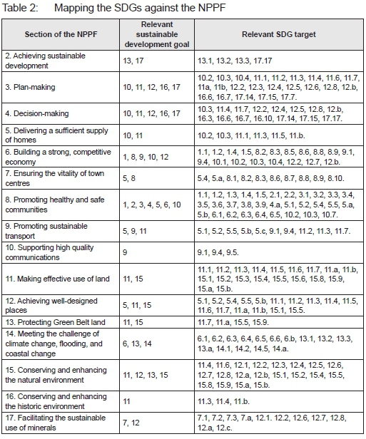 Paragraph 7 of the NPPF states: "The purpose of the planning system is to contribute to the achievement of sustainable development." The NPPF would have been the natural document in which to set out a framework for achieving SDGs. However, the updated NPPF makes no reference to the SDGs or how they might be achieved (Geraghty, 2019a: 361). Similarly, the DFID (2017) report on SDGS makes no reference to urban planning or the NPPF.