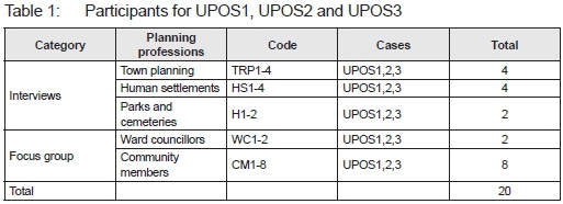 Whereas the former was used for collecting data from a purposively selected sample of 10 planners working in the local government department, the latter was utilised for data collection from a purposively selected sample of 10 community representatives dwelling in residential neighbourhoods within the selected cases or in proximity to these cases (see Table 1). Purposive sampling, as applied to qualitative research, involves the selection of participants who are deemed able to contribute to the phenomenon being investigated, due to their possession of relevant knowledge or experience (Plano-Clark & Creswell, 2015: 332). Furthermore, this sampling method allows the researcher to rely on his/ her own experience or previous research in selecting the sample and, in most cases, the researcher is familiar with the study area and the participants (Wagner, Kawulich & Garner, 2012: 93). Semi-structured interviews avail researchers with the flexibility to explore the complexity of the research problem from the interviewee's perspective (Merriam & Tisdell, 2016: 110). Open-ended questions were employed to elicit answers from interviewees. Central to the interviews was the need to establish the intrinsic values, which the planning professionals working within the study context brought to bear during decision-making processes pertaining to UPOS planning and management within the study area.